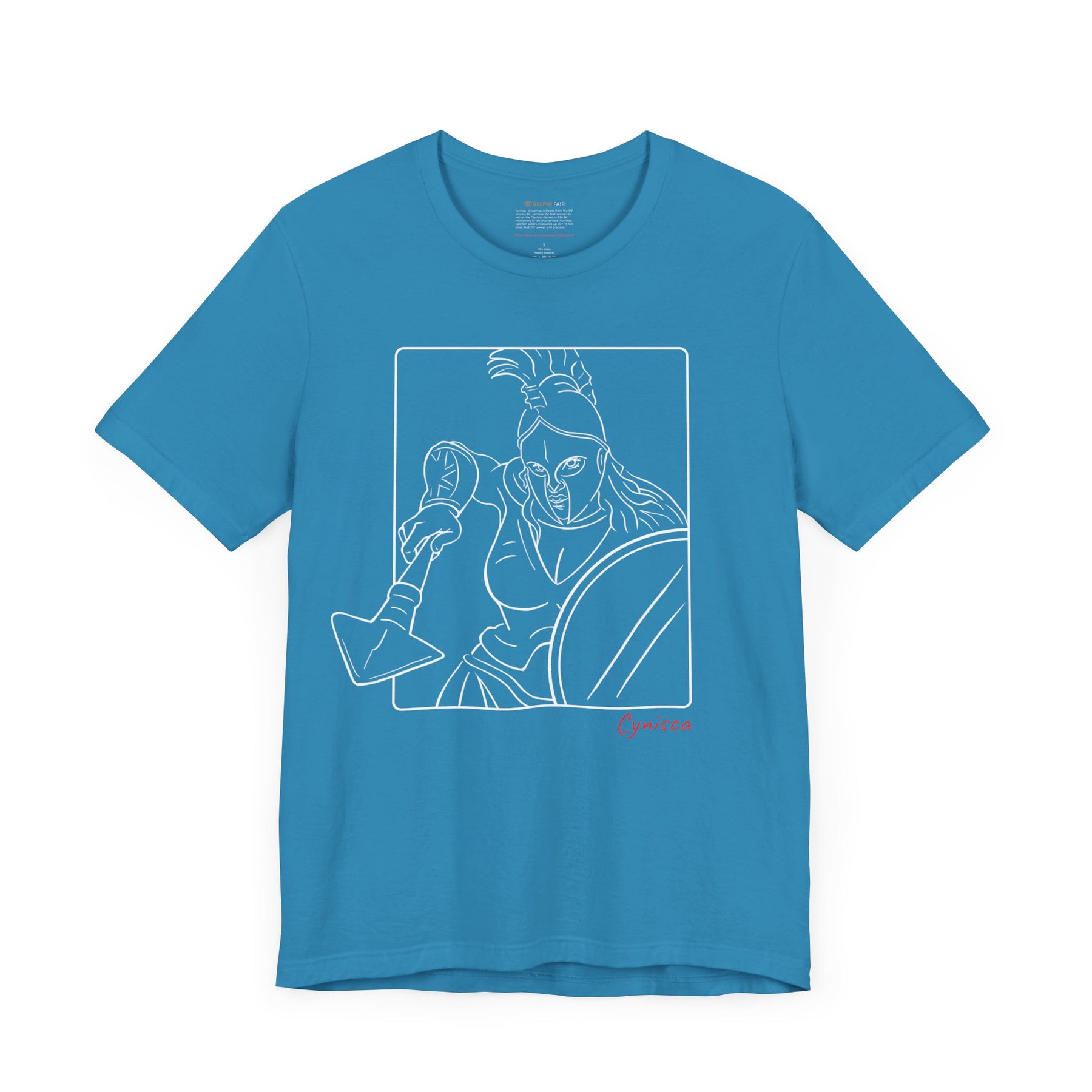 Aqua t-shirt with a white line graphic of Cynisca in a dynamic close-up pose, wearing a helmet and holding spear and shield inside a rectangular frame, with the red text 'Cynisca' below the design.