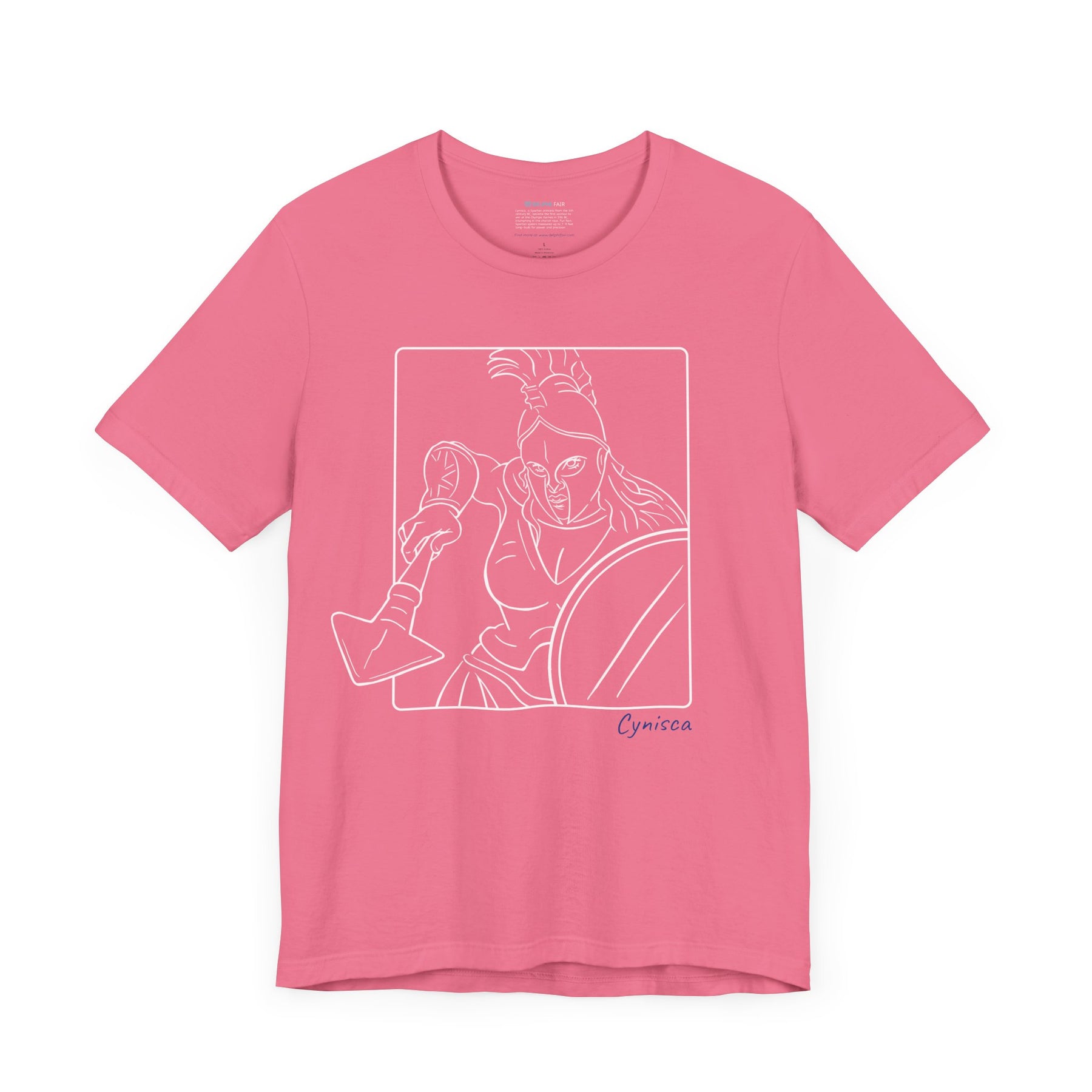 Pink t-shirt with a black line graphic of Cynisca in a dynamic close-up pose, wearing a helmet and holding spear and shield inside a rectangular frame, with the blue text 'Cynisca' below the design.
