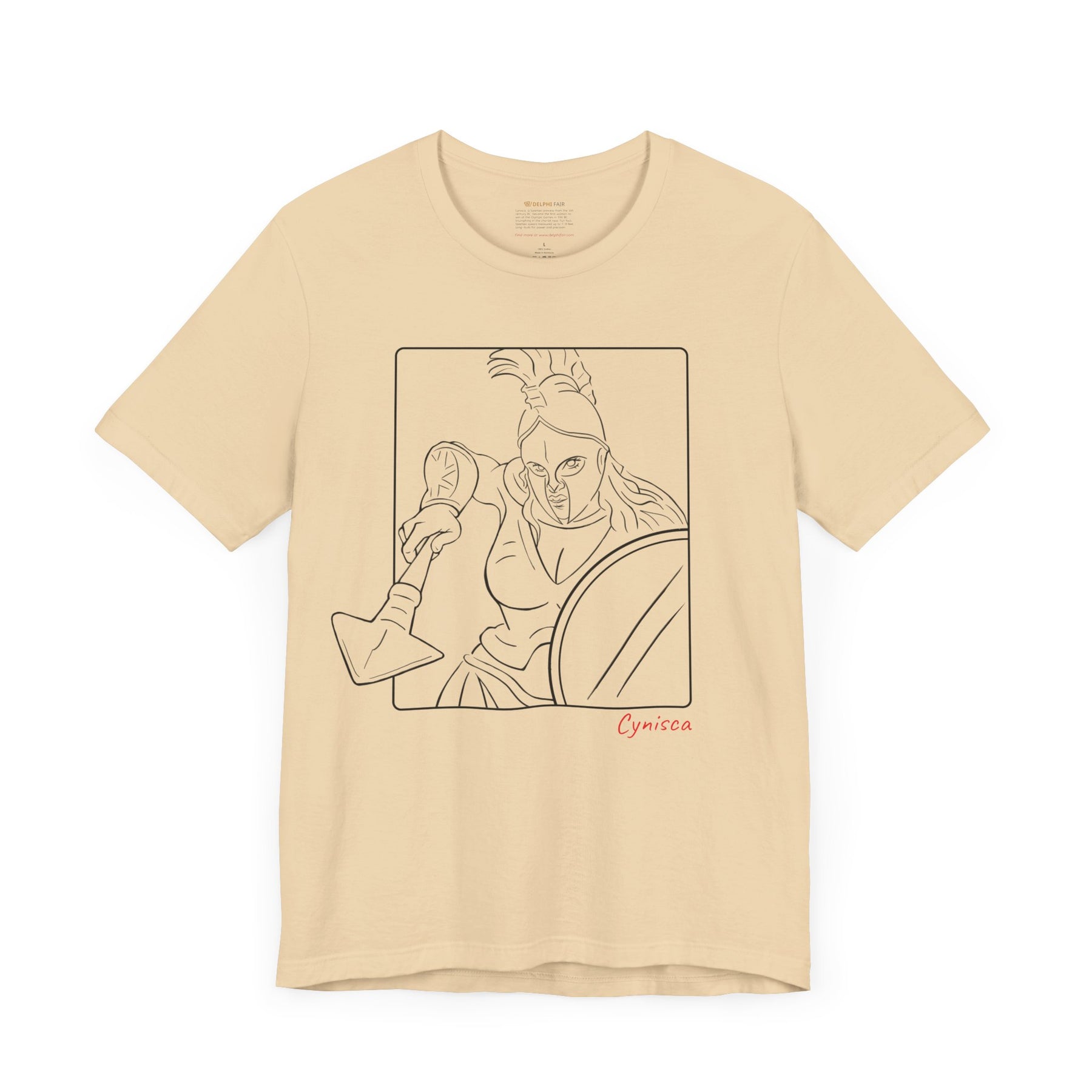 Soft-cream t-shirt with a black line graphic of Cynisca in a dynamic close-up pose, wearing a helmet and holding spear and shield inside a rectangular frame, with the red text 'Cynisca' below the design.
