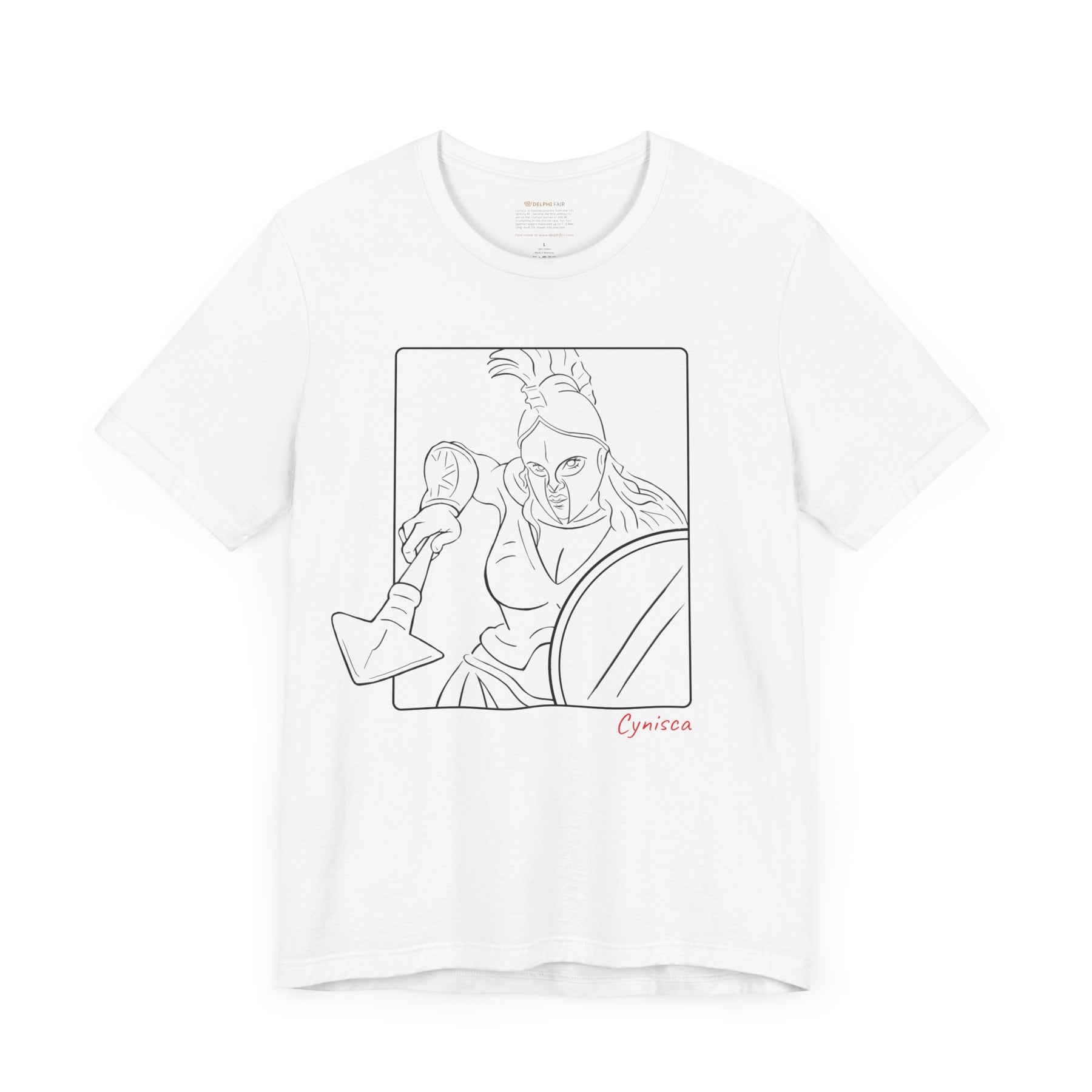 White t-shirt with a black line graphic of Cynisca in a dynamic close-up pose, wearing a helmet and holding spear and shield inside a rectangular frame, with the red text 'Cynisca' below the design.